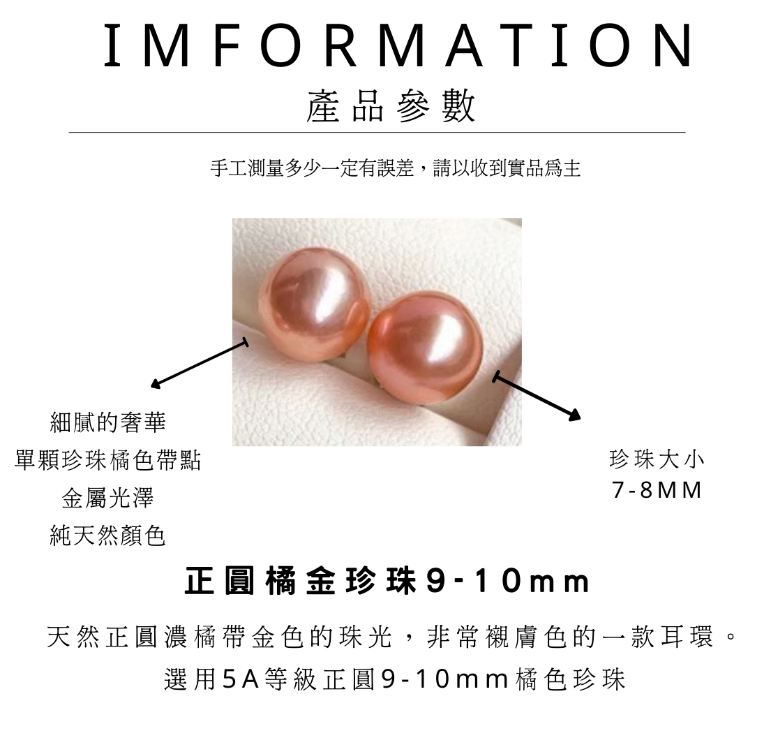 天然正圓濃橘帶金色的珠光,非常襯膚色的一款耳環。